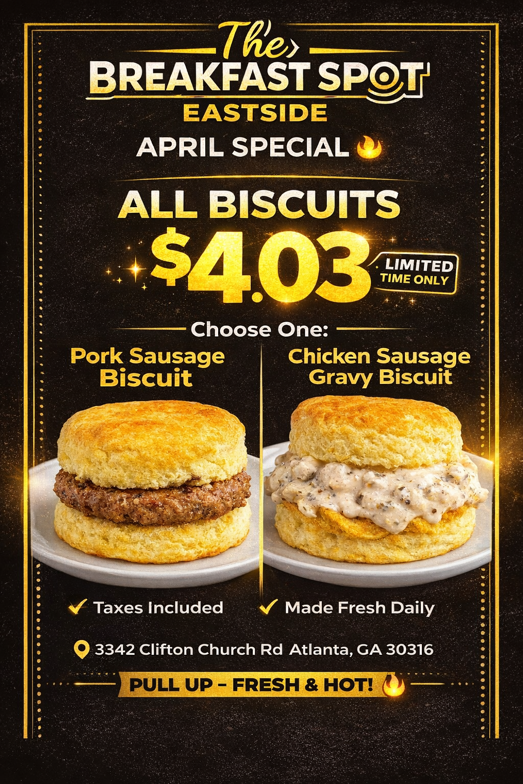 Welcome to The Breakfast Spot Eastside, Atlanta’s breakfast oasis! Here, mornings begin with flavorful brunch dishes and classic comfort food that feels just like home. Our menu includes house specialties and creative options, each one made with the freshest ingredients.